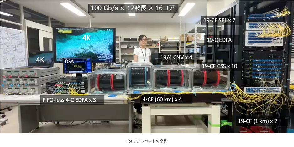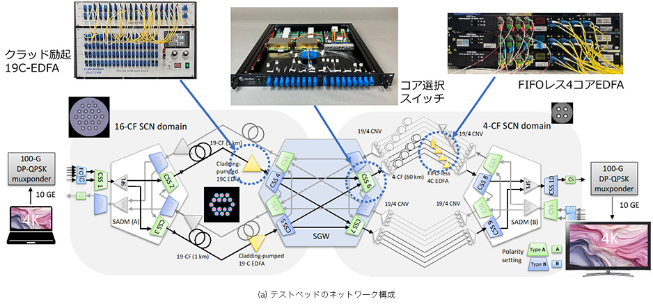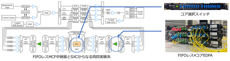 空間クロスコネクト装置とマルチコアファイバ光増幅器からなる大規模な空間多重光ネットワークの実証実験に初めて成功