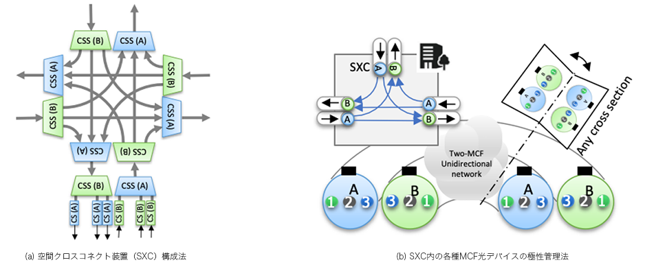 (1) 光ノード・光ネットワーク技術(香川大学):装置サイズの拡張性と接続自由度に優れた、コア選択スイッチ(CSS)に基づく空間クロスコネクト装置(SXC)構成法とSXC内の各種MCF光デバイスの極性[15]管理法(図3)