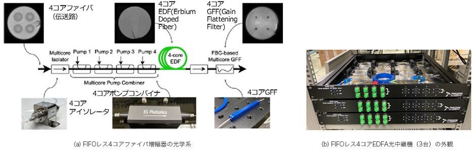 - 空間多重・分離器(ファンイン・ファンアウト:FIFO[11])を介することなく励起光をエルビウム添加4コアファイバに注入することで、低雑音な光増幅を可能としたFIFOレス4コアファイバ増幅器(KDDI総合研究所)(図4)