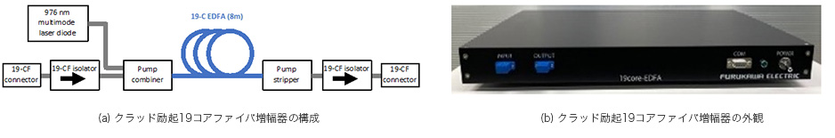 - 19本のコアを一括で励起可能な、クラッド励起[14]19コアファイバ増幅器(古河電工)(図6)