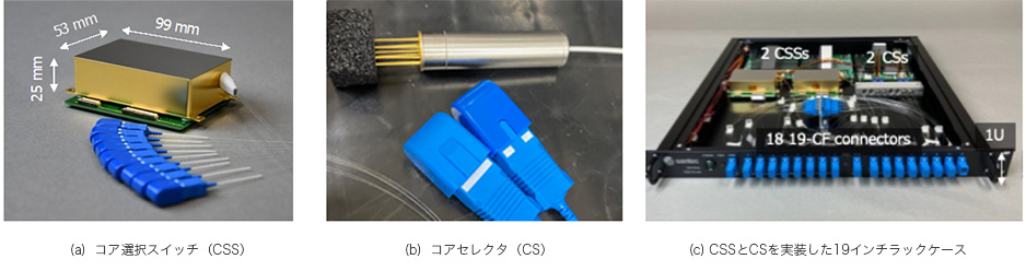 [16]コアセレクタ(CS):入力MCFポートと出力単一モードファイバ(SMF)をもつ光デバイス。入力SMFのコアを出力MCF中の任意のコアに出力することができます。コア選択スイッチ(CSS)(用語の解説[10]参照)と一緒に用いれば、クライアント光信号を、任意の方向のマルチコアファイバリンクの任意のコアに接続可能な、高い接続自由度をもつ空間クロスコネクト装置(用語の解説[2]参照)が実現できます。