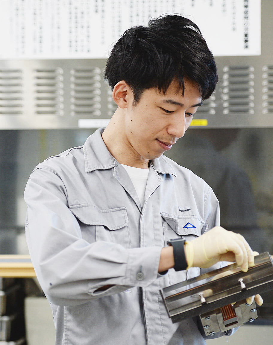 現在、データセンタ向けの放熱部品「ヒートパイプ」の開発・設計に携わっています。顧客は米国最大手企業で、顧客の声をもとにオーダーメイド製品をつくっていくのです。私の役割としては技術営業。直接のヒアリングにも同席し、その後設計・製造・納品までを一貫して責任者として見ていく役割です。そのため顧客との商談時にはアメリカに出張にも行きますし、状況に応じて図面の作成や解析をディレクションしたり、製品を量産するフェーズまでたどり着けば、また別の国の工場へ赴き生産技術的な役割を果たしたりすることもあります。関わる部署や協力会社なども多く、志望動機の通り、なかなかに幅広い働き方ができているように思います。ちなみに3年目までは研究室を拠点に、さまざまな実験を通じてヒートパイプに関する知見を広めていました。一気に外部との接点が増えたのは、4年目になり放熱部品全体の設計を担当する技術科に異動して複数のプロジェクトを担当するようになってからです。本当に仕事内容がガラッと変わった印象です。