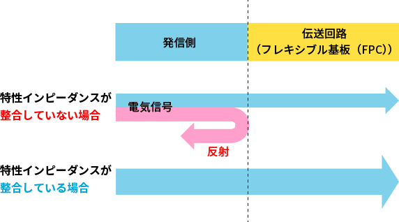特性インピーダンスは、電気信号が伝送線路を流れる際の、電圧と電流の比です。電気信号の発信側と受信側を伝送線路がつなぐ場合、それぞれの特性インピーダンスが一致(整合)していないと、その境界で電気信号の一部が反射し、信号の損失や、反射した電気信号との干渉による信号の劣化が生じます。(下図)