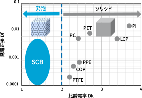 Smart Cellular Board(SCB)は、発泡技術を利用することで、ソリッドな樹脂では得ることが難しい、2.0未満の比誘電率(εr、Dk)を実現しています。