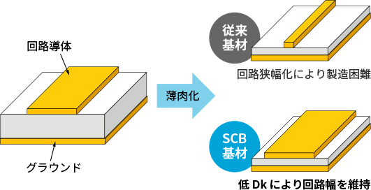 一方で、Smart Cellular Board(SCB)を誘電体基材として、フレキシブル基板(FPC)を薄肉化する場合、基材の比誘電率(εr、Dk)を低減することで特性インピーダンスを維持でき、回路導体の狭幅化を抑制することができます。この対応により、フレキシブル基板(FPC)の更なる薄肉化を、実現することが可能になります。