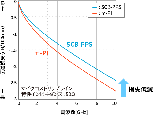 一方で、Smart Cellular Board(SCB)は、発泡技術を利用することで、比誘電率(εr、Dk)と誘電正接(tanδ、Df)をどちらも低減することが可能で、両方向から、誘電損失を低減することが可能です。図は、従来、モバイル通信端末用高周波フレキシブル基板(FPC)に使用されるm-PIとSCB-PPSのそれぞれを、誘電体基材として用いたときの、伝送特性をシミュレーションで比較した結果です。SCB-PPSを使用することで、伝送損失の低減が期待できます。