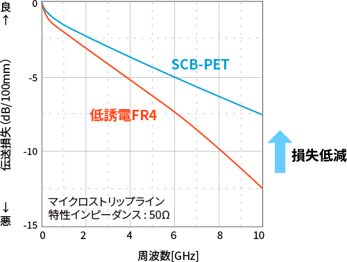 図は、従来使用される低誘電FR4とSCB-PETのそれぞれを、誘電体基材として用いたときの、伝送特性をシミュレーションで比較した結果です。SCB-PETを使用することで、伝送損失の低減が期待できます。