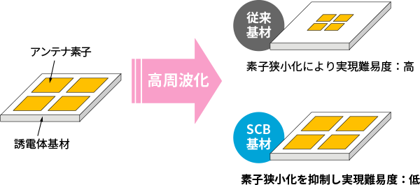 このため、Smart Cellular Board(SCB)をアンテナ基板の誘電体として用いることで、式1による誘電体内での波長短縮が抑制され、その結果、フェーズドアレイアンテナのアンテナ素子の狭小化を、抑制することができます。(下図)