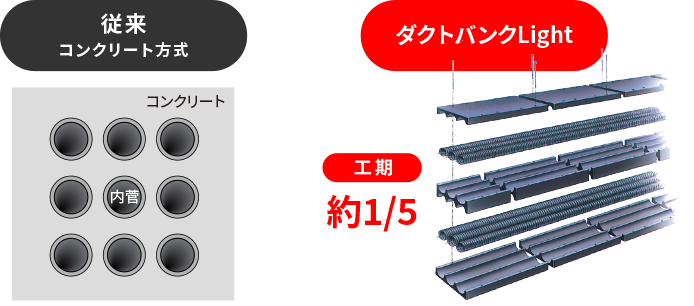 内管と構造体ユニットの組立方式により従来方式で必須なコンクリート養生期間が不要。