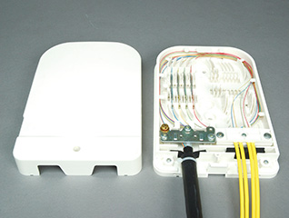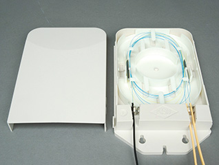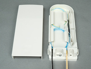 - 丸ケーブルとドロップ / インドアケーブルとの接続が可能な屋外壁掛け用小型接続箱