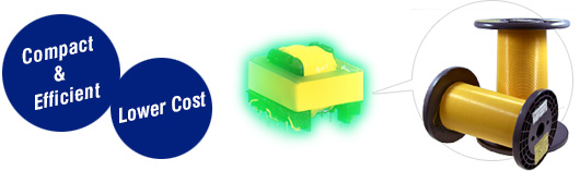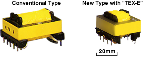 Triple Insulated Wires "TEX-E Series" save insulation tape or barrier tape between the primary and secondary coils and contribute to realize size and cost reduction or high efficiency of transformers. "TEX-E Series" paves the way to the sophisticated switching transformers.