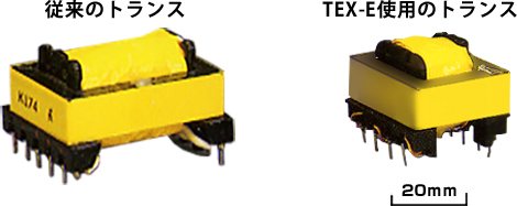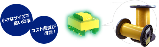 3層絶縁電線(強化絶縁電線)「TEX-E」を用いると1次、2次コイル間絶縁テープとバリアテープが不要になります。そのため変圧器のサイズが小さくなり、高い効率とコスト削減を生み出すという特長を有しています。「TEX-E」はスイッチング変圧器にとって最も必要な条件を満たしています。