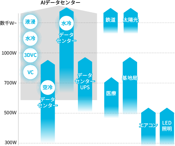 また、AIサーバーを多数設置する必要性からデータセンターの高密度化が進んでおり、効率的かつ環境負荷を低減する冷却技術も求められています。古河電工では従来の空冷技術に加え革新的な水冷・液浸技術を導入することで、増大する発熱量に対応し、データセンターの安定稼働に貢献しています。