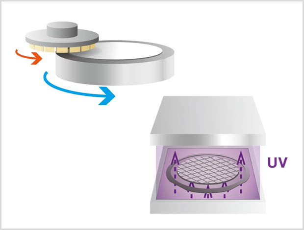 UV胶带在各个工艺过程之间作为暂时保持・搬送对应的胶带
