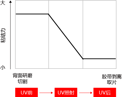通过UV照射低分子量聚合物之间引起聚合反应,从而形成新的网眼构造。其结果是,粘结剂层变成双重网眼构造并且硬化,结果造成粘结力降低。