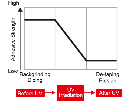 The most suitable UV condition for UV-TAPE differ by tape grade, kind of UV lamp, and wafer surface conditions.