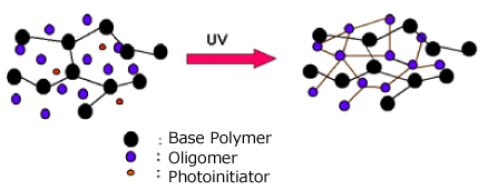 Only base polymer has polymerization structure. Oligomer is not reacted yet, and it has a fluidity. Due to the fluidity, it’s a strong adhesion before UV irradiation.
