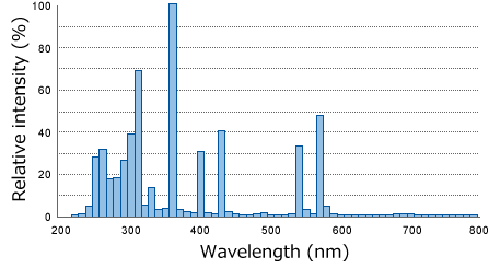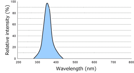Main wave length is 365nm same as Metal-halide lamp. Others efficient wave length are 254nm, 303nm, 405nm and 436nm.