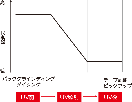 弊社のUVテープの場合、技術資料に推奨UV照射量を記載してありますので、これをご参考に最適照射条件をご検討下さい。