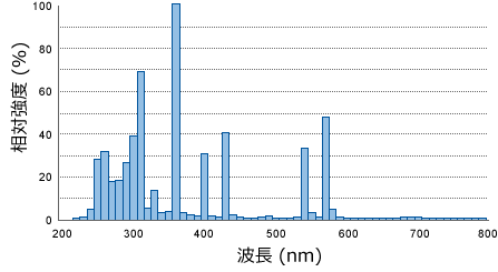 365nmを主波長として254nm、303nm、405nm、436nm等の波長も効率良く放射するランプです。